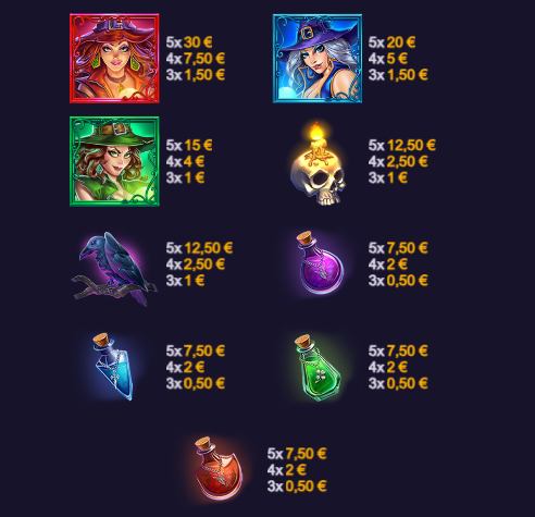 Halloween Fortune Cash Collect drips with Halloween atmosphere and layers it with innovative gameplay mechanics that keep every spin exciting. Visually, the game is set against a haunted graveyard at midnight – you’ll see crooked trees, glowing jack-o’-lanterns, bubbling cauldrons, and a full moon peeking through eerie clouds. The three witches (one redheaded, one blonde, one brunette/green-themed) each have distinct looks and personalities, drawn in that signature Playtech style that’s both polished and playfully spooky. Symbols like the black raven and the skull candle reinforce the theme, while the colorful potion bottles (purple, blue, green, red) add a nice contrast on the reels. The soundtrack is appropriately haunting – expect suspenseful tones, cackling laughter on wins, and a general “things that go bump in the night” vibe that pulls you into the theme without being overbearing.
