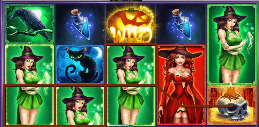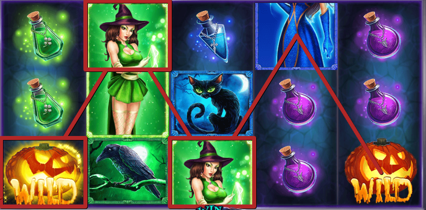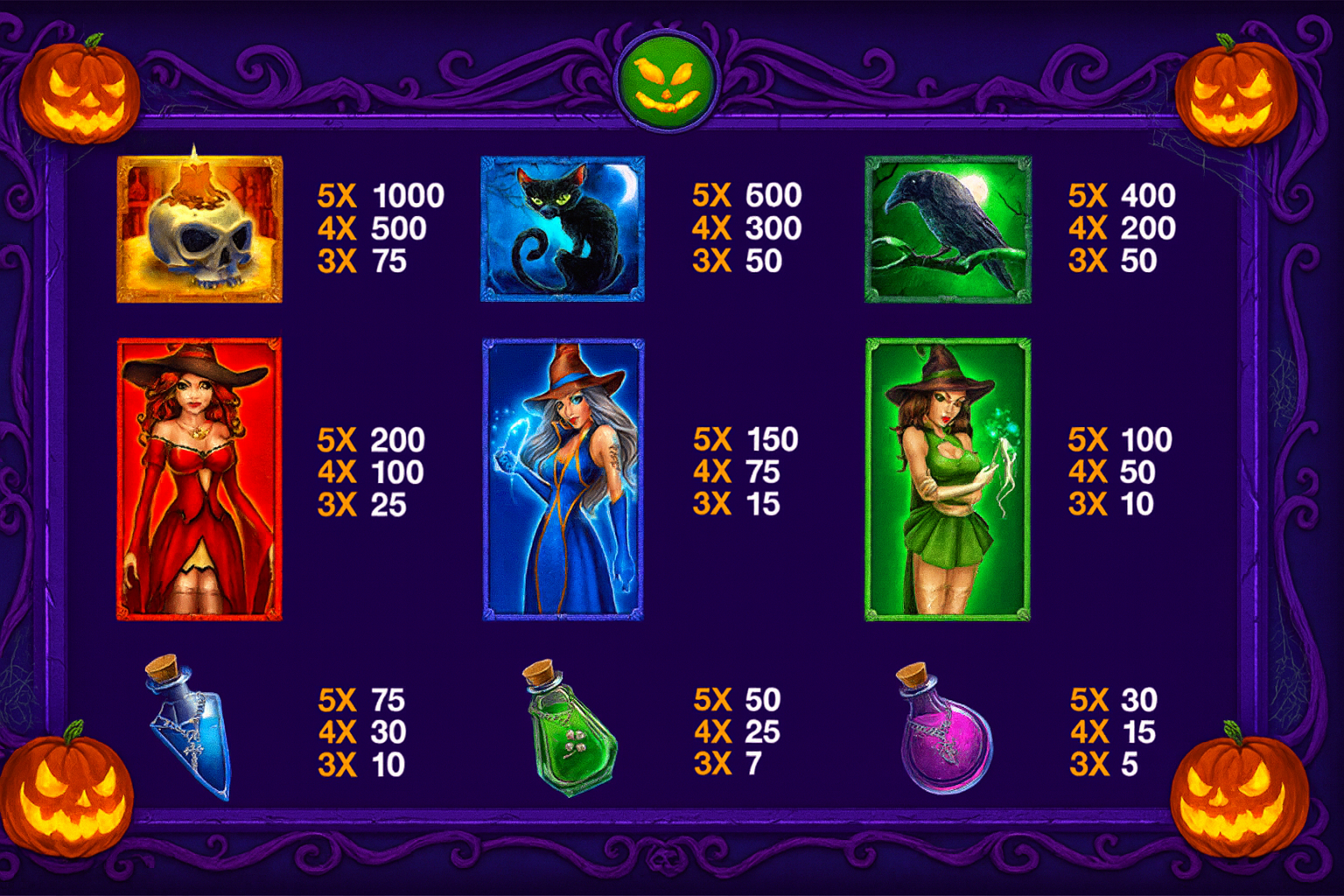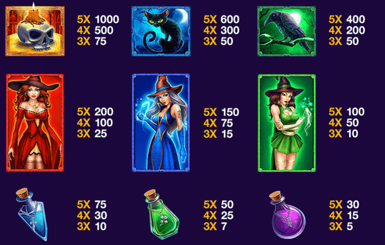 - Combinazioni vincenti: servono almeno 3 simboli uguali su una payline per vincere. Fanno eccezione i simboli di alto valore (streghe, Wild) che pagano anche con 2 in linea.