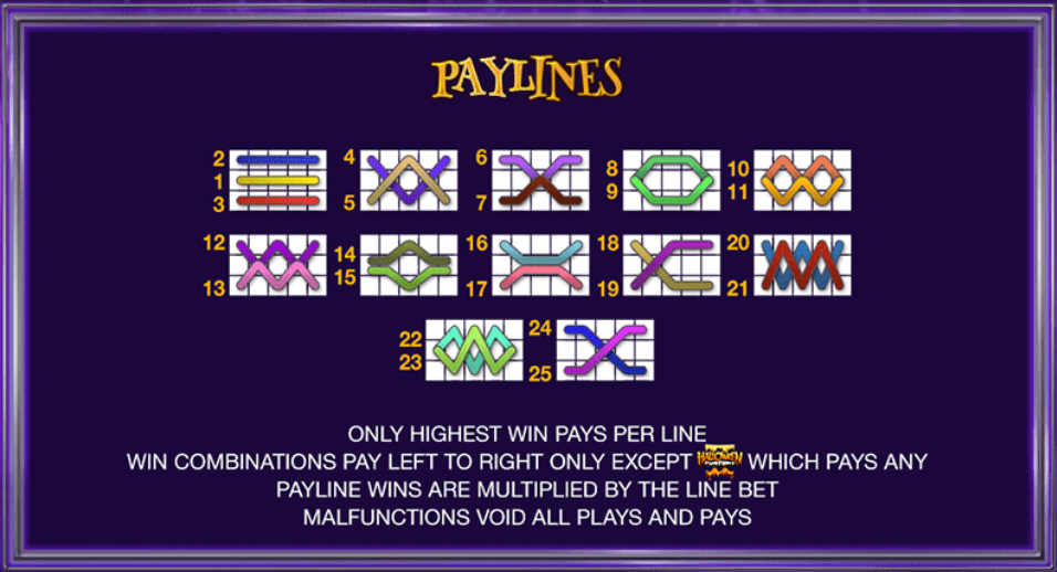 Dal punto di vista delle meccaniche, Halloween Fortune 2 è una slot a 25 linee fisse, quindi ogni giro gioca automaticamente su tutte le linee di pagamento disponibili. Le combinazioni vincenti pagano da sinistra verso destra: bisogna ottenere simboli uguali su rulli adiacenti a partire dal primo. Per la maggior parte dei simboli servono almeno 3 simboli in fila per generare una vincita, ma alcuni simboli di alto valore pagano già in coppia (ad esempio le streghe e i Wild danno un piccolo payout anche con soli 2 in linea).